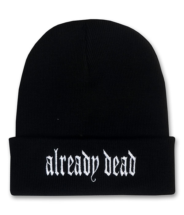 Gothic “Already Dead” embroidery on a black cuffed beanie — dark, warm, and unapologetically bleak.