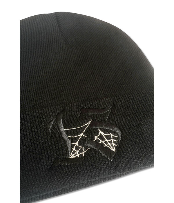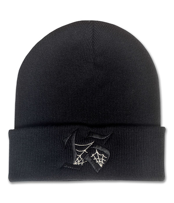 Black cuffed beanie hat with black embroidered 13 and spiderweb detail. Stealthy, punk, and cold-weather ready.