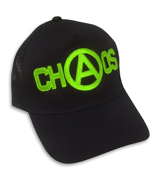 Black punk trucker cap with neon green CHAOS embroidery — bold, rebellious, and built for chaos by Poison Clothing.