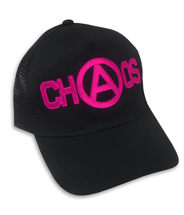Black punk trucker cap with bold hot pink CHAOS embroidery — loud, defiant, and built for rebellion by Poison Clothing.