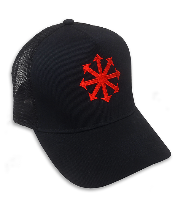 A bold black Chaos Star punk trucker cap with red embroidery — perfect for rebels, punks, and chaos magick lovers.