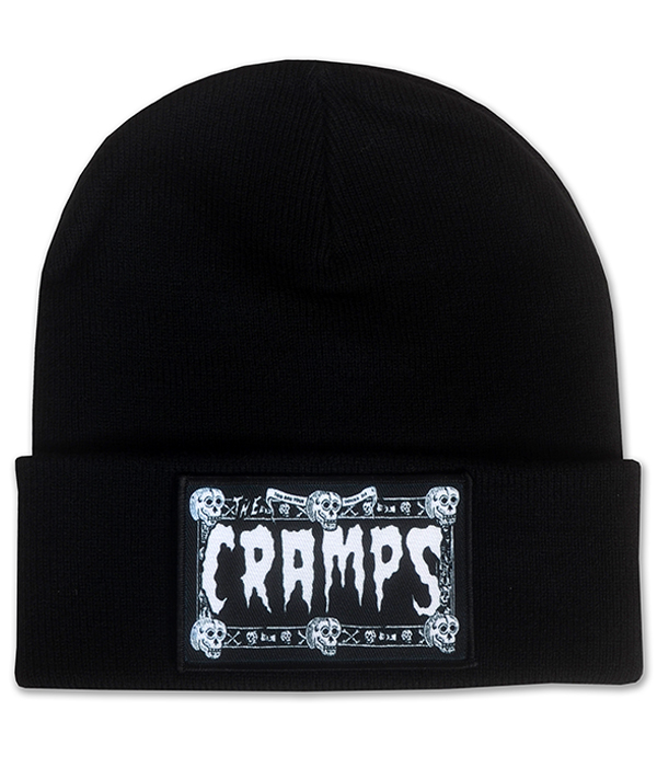 The Cramps psychobilly beanie hat in black with skull logo patch. Graveyard rock ‘n’ roll punk winter cap.
