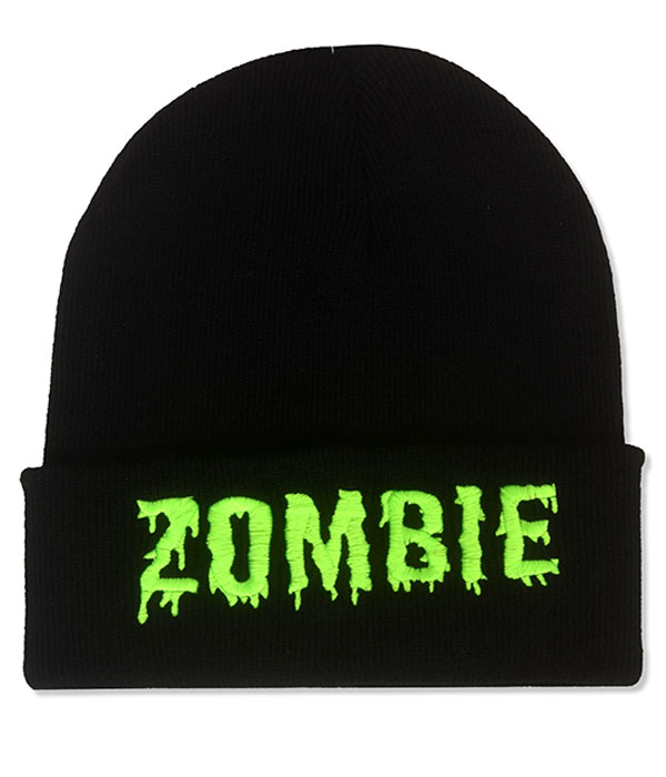 Black cuffed beanie with neon green dripping ZOMBIE embroidery. Warm horror punk streetwear for cold nights and undead style.