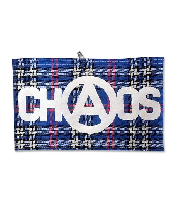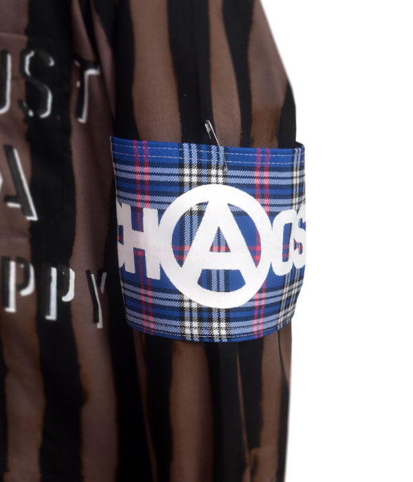 Blue tartan chaos armband with bold white “CHAOS” and anarchy symbol print. Seditionaries-inspired, includes safety pin.