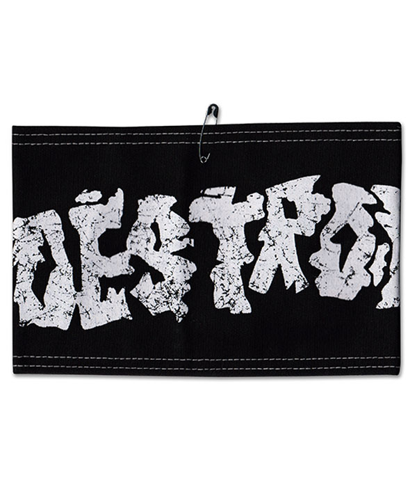 Black cotton punk armband featuring a cracked white “DESTROY” print in Seditionaries style. Includes safety pin.