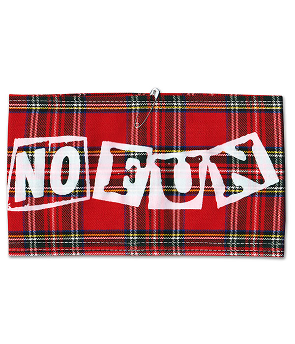 Red tartan punk armband with bold white “NO FUN” stencil print in Seditionaries style. Finished with stitching and a safety pin.