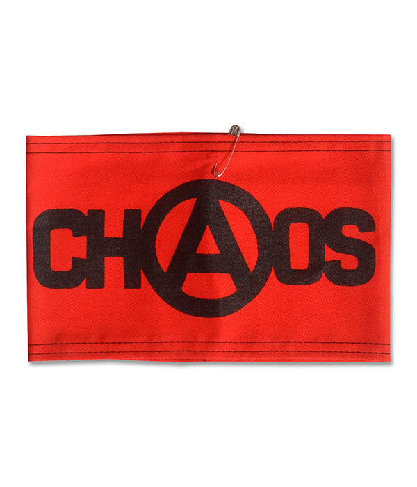 Red armband with black “CHAOS” anarchy print and safety pin. Seditionaries-inspired punk statement piece.