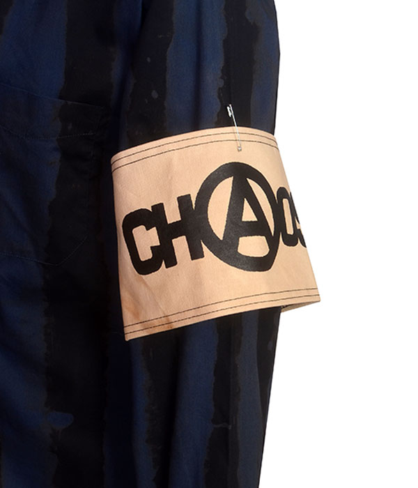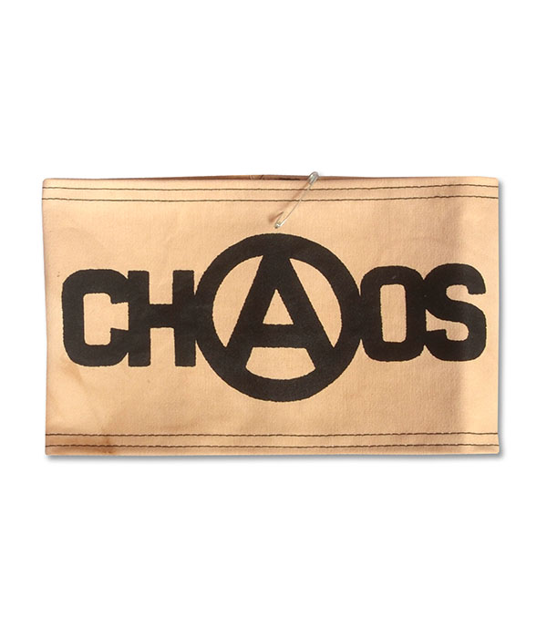DIY punk tea-stained Chaos armband, printed Seditionaries style and safety-pinned for filthy anarcho glory.
