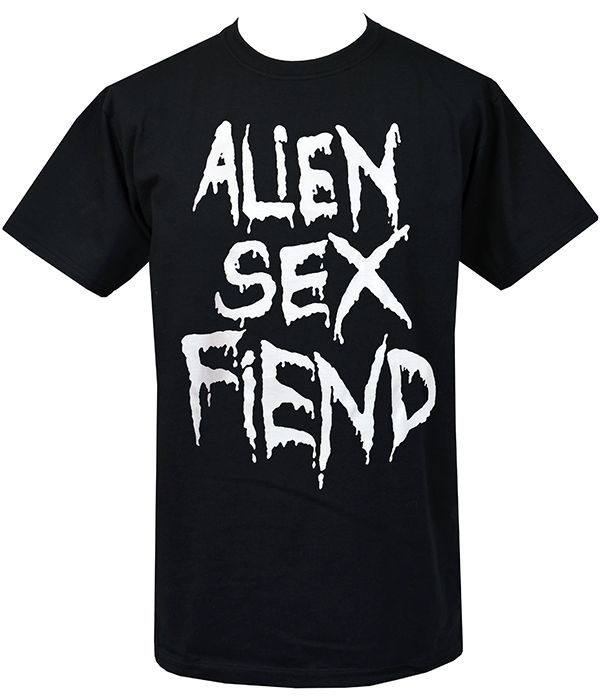 Alien Sex Fiend men’s black t-shirt featuring the iconic white gothic logo. A must-have for goth punk, death-rock and batcave era fans.
