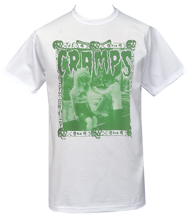 Men’s white Cramps psychobilly punk t-shirt with a high-contrast green graphic, drawing from underground punk, rockabilly and horror style.