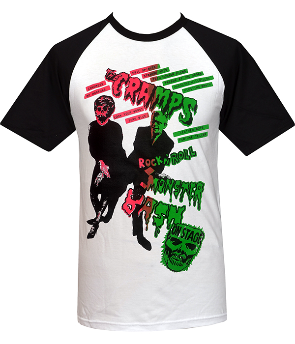 Step straight into a sleazy, neon-splattered Monster Bash with this The Cramps raglan T-shirt, designed for anyone who lives and breathes psychobilly mayhem. With its black sleeves and white body, the classic raglan cut gives you that perfect retro rock ’n’ roll silhouette, while the pink and slime-green artwork blasts across the front like a twisted gig poster torn from a back-alley wall.