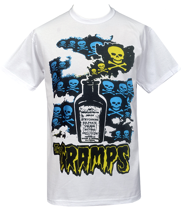 A bold psychobilly punk t-shirt inspired by The Cramps, featuring a Strychnine bottle graphic with skull and crossbones artwork.