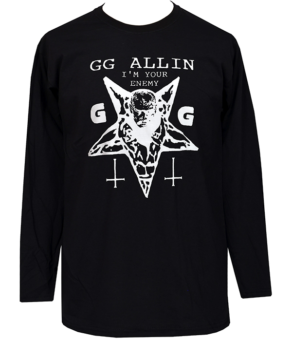 GG Allin “I’m Your Enemy” men’s long sleeve T-shirt in black with bold white print. Pure punk attitude for gigs and everyday rebellion.