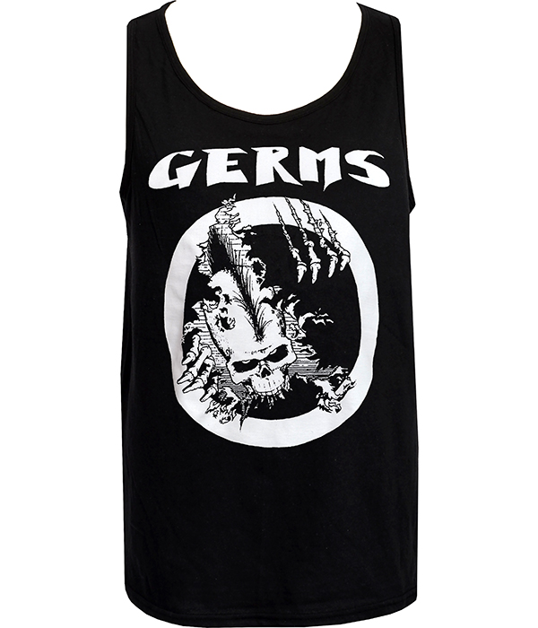 Germs men’s black punk tank top with bold white skull and circle graphic.