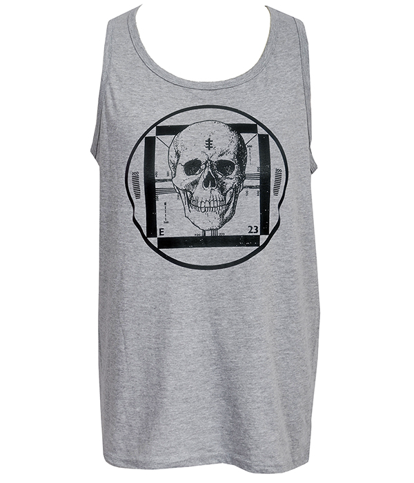 Psychic TV skull tank top in grey with industrial test card design. A cold, minimal sleeveless vest with underground punk edge.