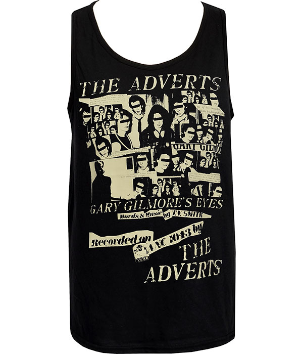 A men’s black tank top featuring The Adverts’ Gary Gilmore’s Eyes single artwork in bold vintage punk collage style.
