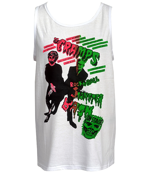 A men’s The Cramps Monster Bash tank top with bright pink and green psychobilly artwork, perfect for punk and horror-rock fans.