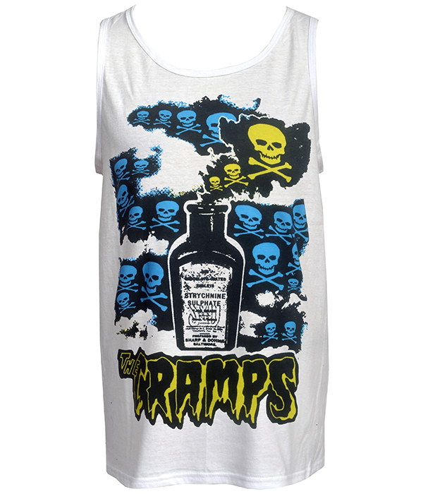 A psychobilly punk men’s tank top inspired by The Cramps, featuring a bold Strychnine bottle and skull artwork.