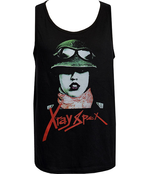Throw on this X-Ray Spex tank top and wear your rebellion loud and proud. Featuring Poly Styrene in her signature helmet-and-goggles look, backed by the band’s screaming red logo.
