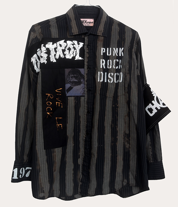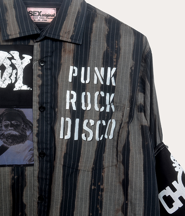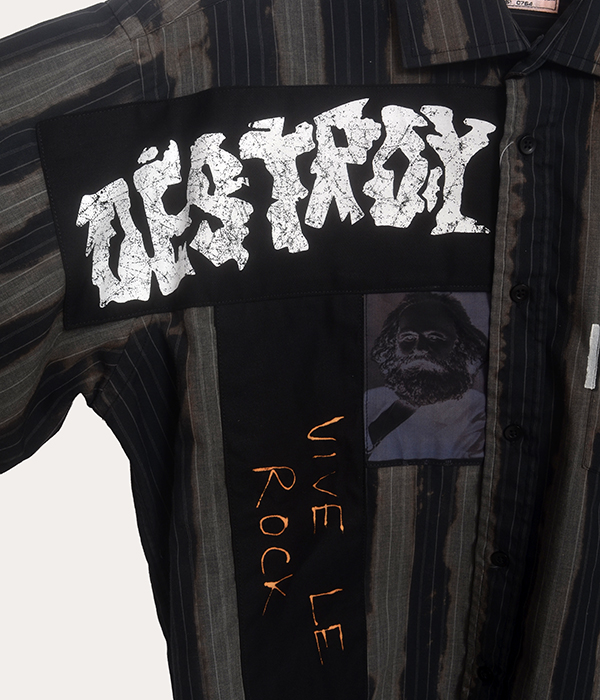 Across the front, layered elements such as “Destroy”, “Punk Rock Disco”, and “Vive Le Rock” reference the collision of music, politics, and street culture that shaped early punk. The graphic panels sit against the striped background with deliberate contrast, giving the shirt the kind of raw visual structure associated with early punk garments.
