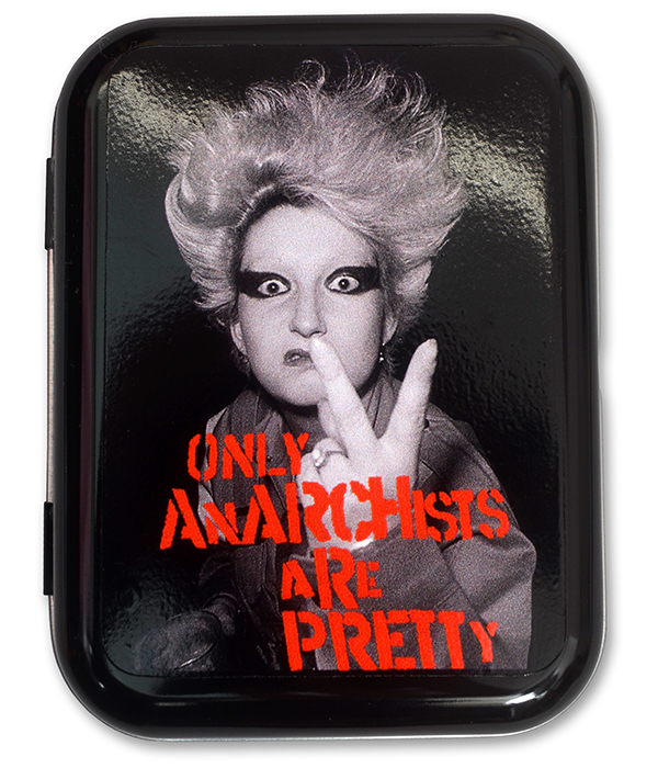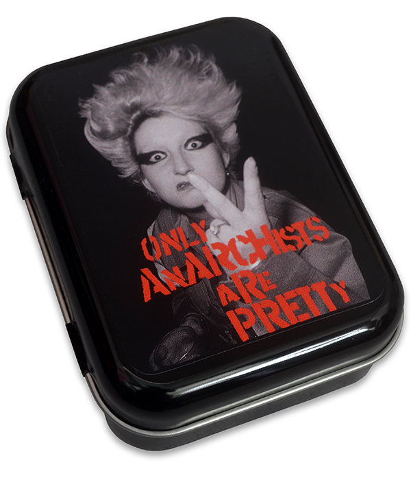 Punk storage tin featuring the iconic Only Anarchists Are Pretty slogan and photo design – perfect for keeping your gear safe with attitude.