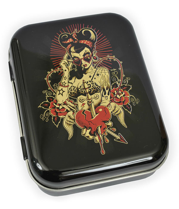Perfect for lovers of rockabilly style, tattoo art and alternative aesthetics, this Heartbreaker tin blends vintage flash design with dark romantic flair.