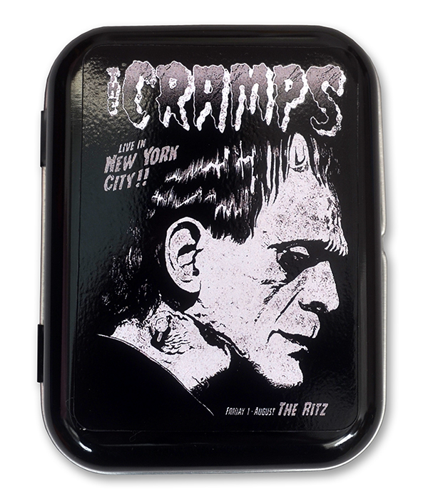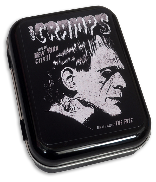 The Cramps Frankenstein tin featuring live show artwork – punk psychobilly storage box perfect for patches, pins, or rolling gear.