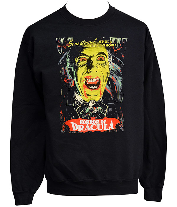 Unisex black sweatshirt featuring a bold, vintage-style Horror of Dracula graphic. A must for horror fans who love their style dark and dramatic.