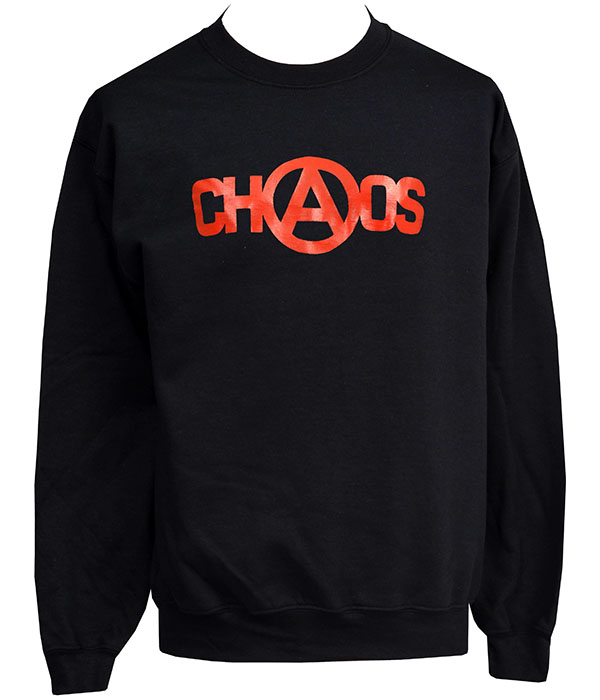 Unisex black sweatshirt featuring a bold red CHAOS and anarchy symbol design—heavily inspired by Seditionaries-era punk fashion.