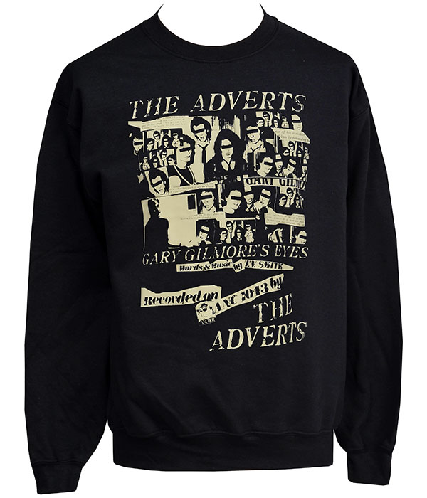 Unisex punk rock sweatshirt featuring The Adverts’ Gary Gilmore’s Eyes collage artwork – raw, loud, and DIY to the core.