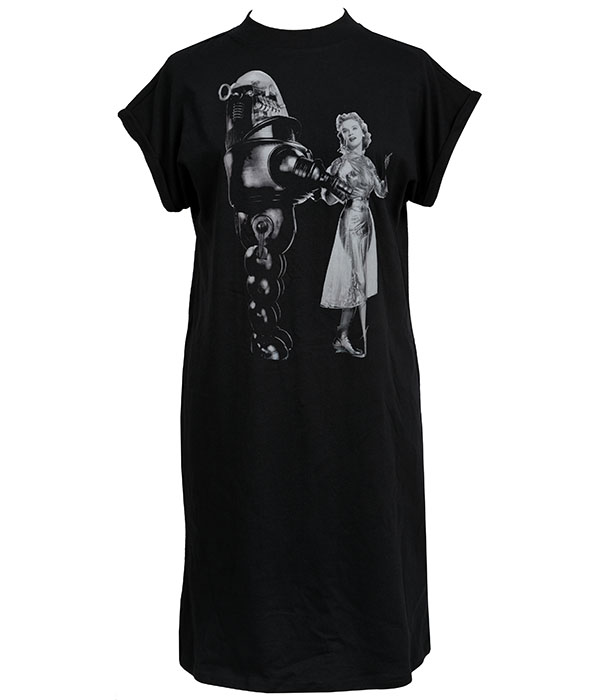 A black T-shirt dress featuring a striking Forbidden Planet inspired print with Robby Robot and Anne Francis in classic vintage sci-fi film style.