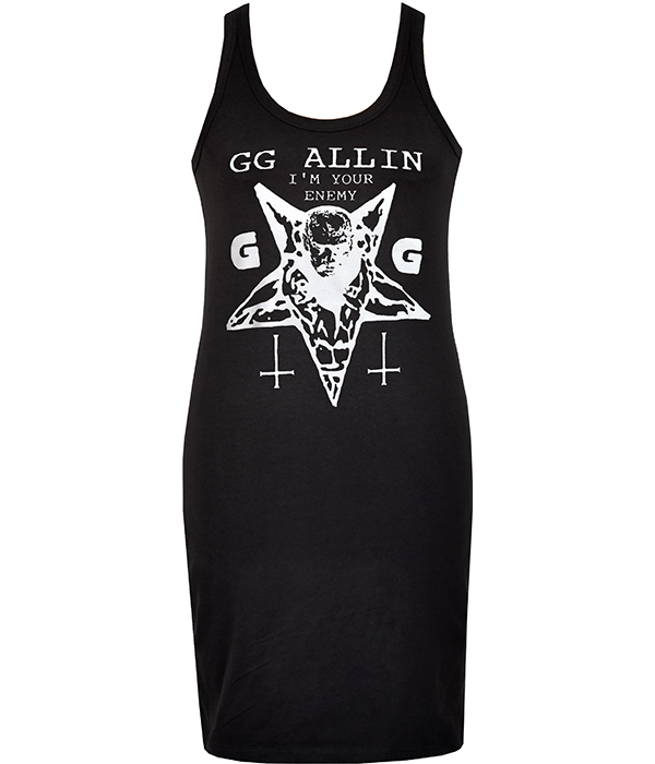 GG Allin “I’m Your Enemy” women’s punk dress in black cotton with bold white print.