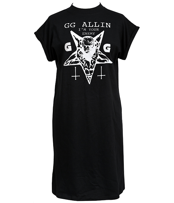 GG Allin “I’m Your Enemy” women’s punk T-shirt dress in black with bold white graphic print.