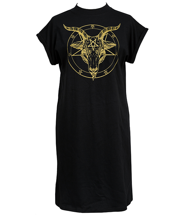 The gold Baphomet t-shirt dress brings witchy elegance and infernal symbolism together in one blazing statement piece.