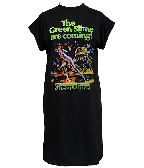 The Green Slime t-shirt dress is your official uniform for surviving alien infestations in go-go boots. Inspired by the cult 1968 Japanese-American sci-fi horror classic The Green Slime, this oversized dress brings grindhouse energy straight to your wardrobe. Featuring a vintage-style print with a screaming space beauty, slime-covered alien beast, and radioactive colours, it’s everything we love about retro trash cinema.