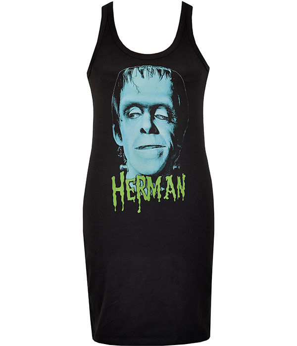 Bring some monstrous charm to your wardrobe with the Herman Munster Dress! This black tank dress features a bold, vintage-style print of the iconic Herman Munster with dripping horror-font lettering. A must-have for classic horror fans and goth queens alike.