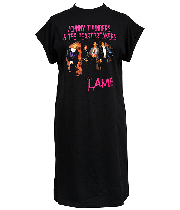 This Johnny Thunders LAMF women’s t-shirt dress is for punks who still believe rock 'n' roll should be dangerous. With a gritty full-colour shot of Johnny Thunders & The Heartbreakers straight from their sleazy heyday, it’s a wearable time capsule from the back alleys of NYC’s punk scene. Printed on a loose-fitting black tee dress, it’s loud, lawless, and made to move.