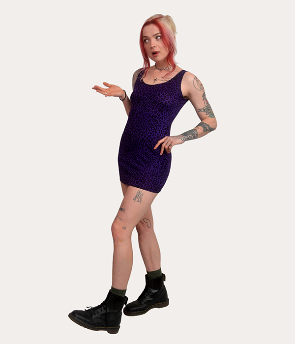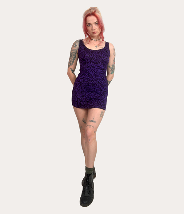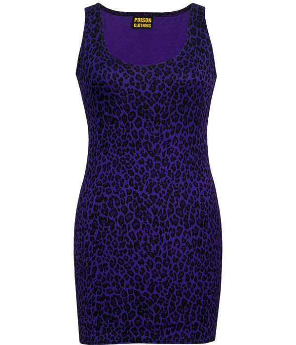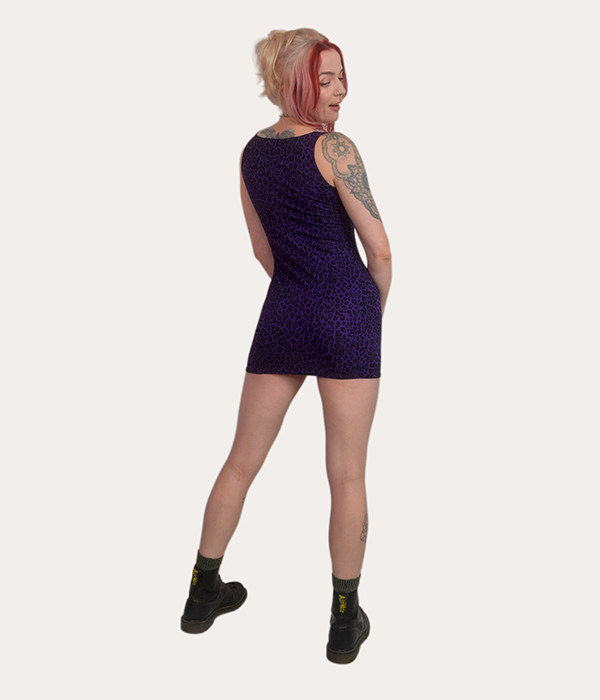Purple leopard mini dress UK – a bold punk-style mini dress made in the UK with a fitted sleeveless shape and striking purple leopard print.