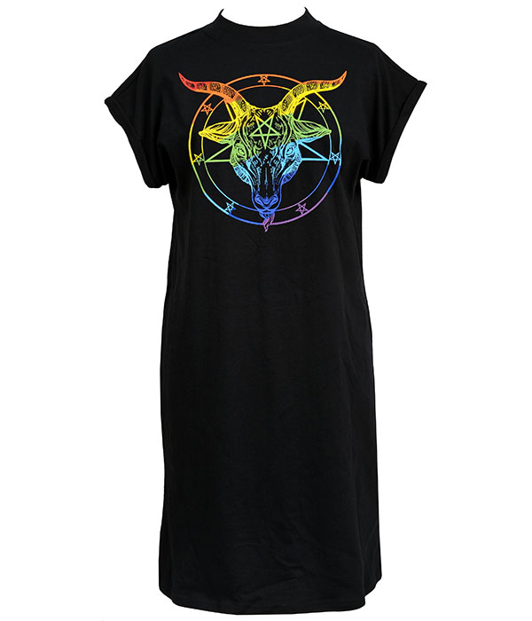 This rainbow Baphomet t-shirt dress fuses queer pride with occult power in one unapologetically fierce look.