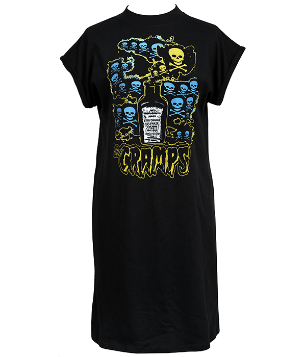 A women’s psychobilly punk t-shirt dress inspired by The Cramps’ Strychnine, featuring skull artwork and garage rock attitude.