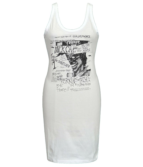 The Cramps women’s tank dress featuring a raw vintage punk flyer print.