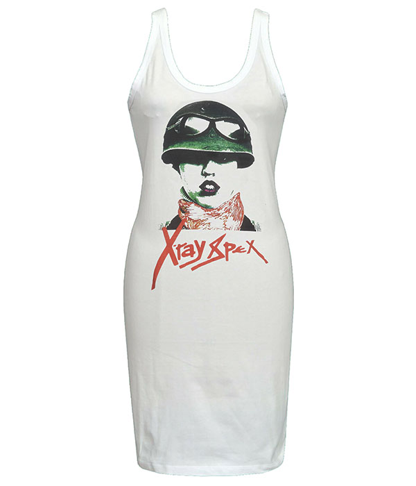 Get ready to stomp the streets in the X-Ray Spex dress, where rebellion meets effortlessly cool style. Featuring the unmistakable image of Poly Styrene in her iconic helmet and the band’s electric logo, this dress screams punk attitude with a touch of bold femininity.
