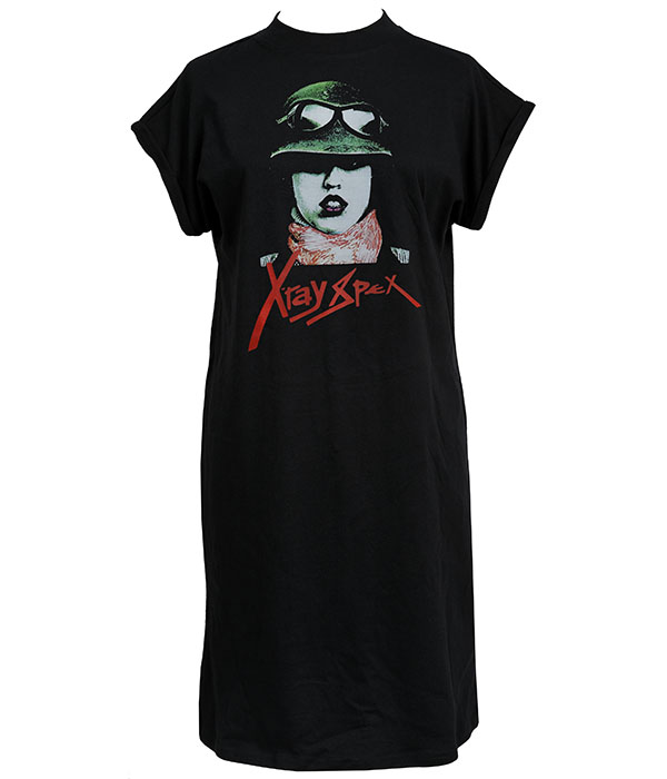 Get ready to stomp the streets in the X-Ray Spex “Poly Helmet” t-shirt dress, where rebellion meets effortlessly cool style. Featuring the unmistakable image of Poly Styrene in her iconic helmet and the band’s electric logo, this dress screams punk attitude with a touch of bold femininity.