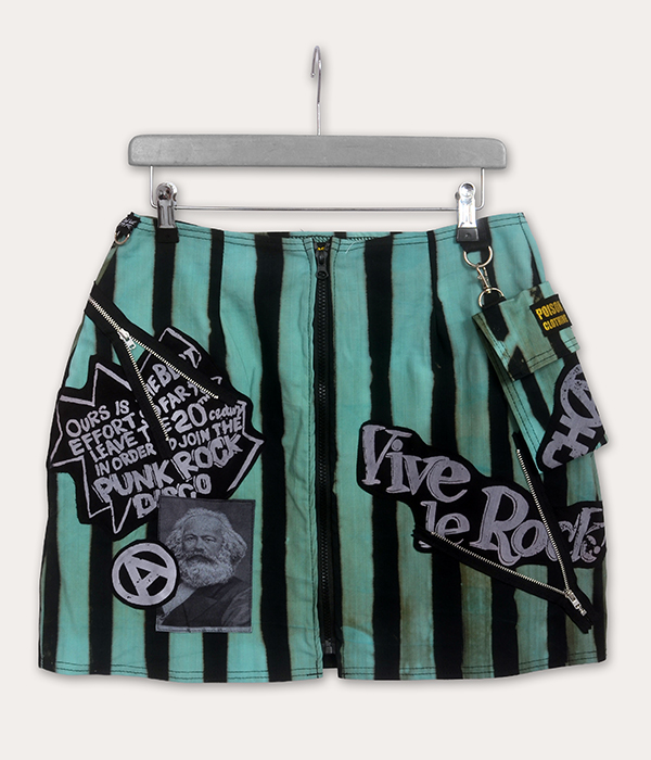This one-off Seditionaries-inspired punk mini skirt doesn’t whisper rebellion; it shouts it through every raw stripe and jagged patch. Made in the UK by Poison Clothing, it blends turquoise-and-black hand-dyed stripes with graphic statements, ripped edges, and a detachable pocket that clips on when you want utility and comes off when you want a cleaner cut. Because punk should always give you options, even when you don’t ask nicely.