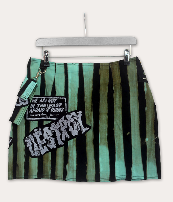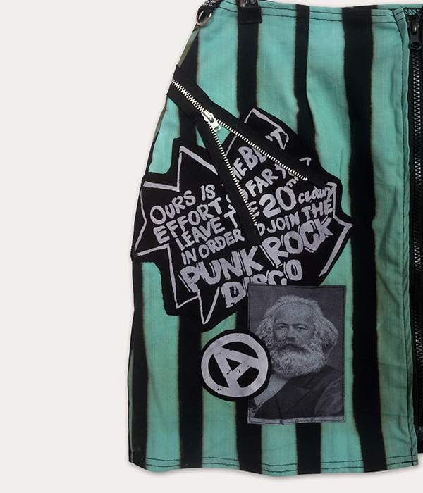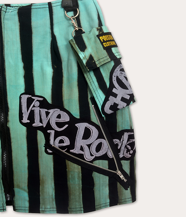 A one-off UK-made Seditionaries-inspired punk mini skirt with bold stripes, Vive Le Rock graphics, Destroy patches, and a detachable pocket.