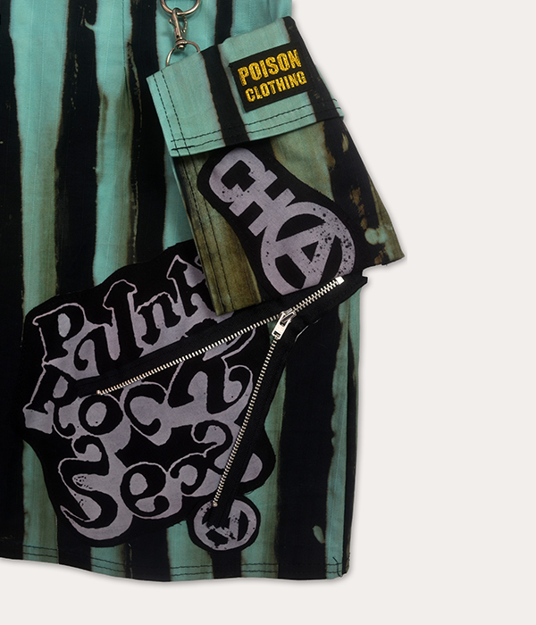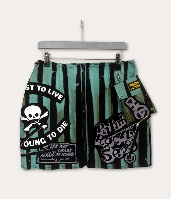 If you want a mini skirt that kicks back harder than the establishment, this one-off Seditionaries-inspired piece from Poison Clothing is ready to start trouble. Hand-made in the UK, it mixes classic DIY rebellion with sharp stripes, raw graphics, and a detachable pocket that snaps on and off like you’re changing your mood. Because real punks adapt fast.