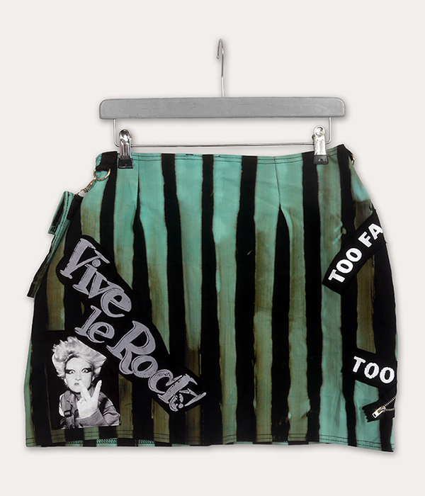 A one-off, UK-made Seditionaries-inspired punk mini skirt with bold stripes, heavy graphics, raw patches and a detachable pocket for custom chaos.