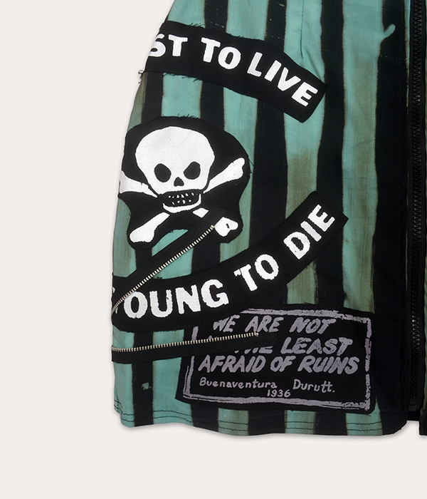 The turquoise-and-black striped base pays tribute to Seditionaries anarchy with bold patches, crooked zips, and slogans that refuse to behave. Every stitch pushes back. Every detail shouts louder. And since it’s a true one-off, you won’t see another soul wearing this exact slice of chaos. That exclusivity matters, especially when you want to stand out without even trying.