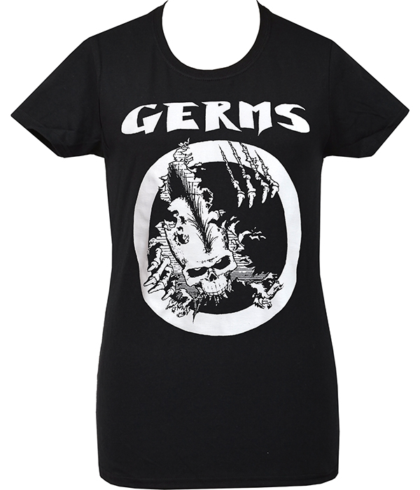 Germs women’s black punk T-shirt with bold white skull and circle graphic.