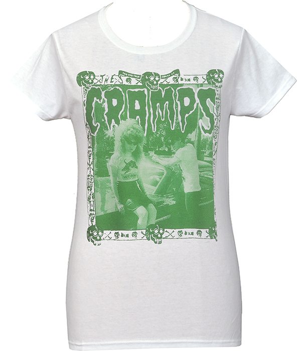 Women’s white The Cramps psychobilly punk t-shirt with a bold green horror-inspired graphic and classic underground fit.